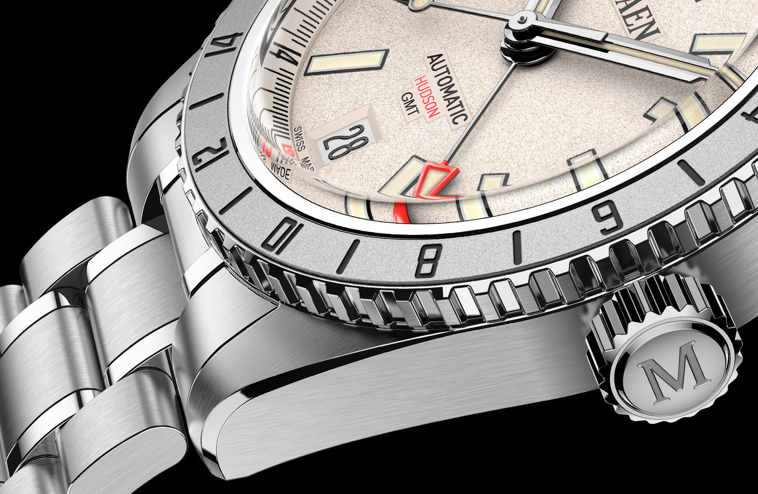 The Hudson 38 GMT is using the brand new case that is developed for the Hudson 38 MK4. This case has been completely re-designed from scratch. The new deeper engraved bezel structure now has a mixed polished and brushed finish ensuring better grip.