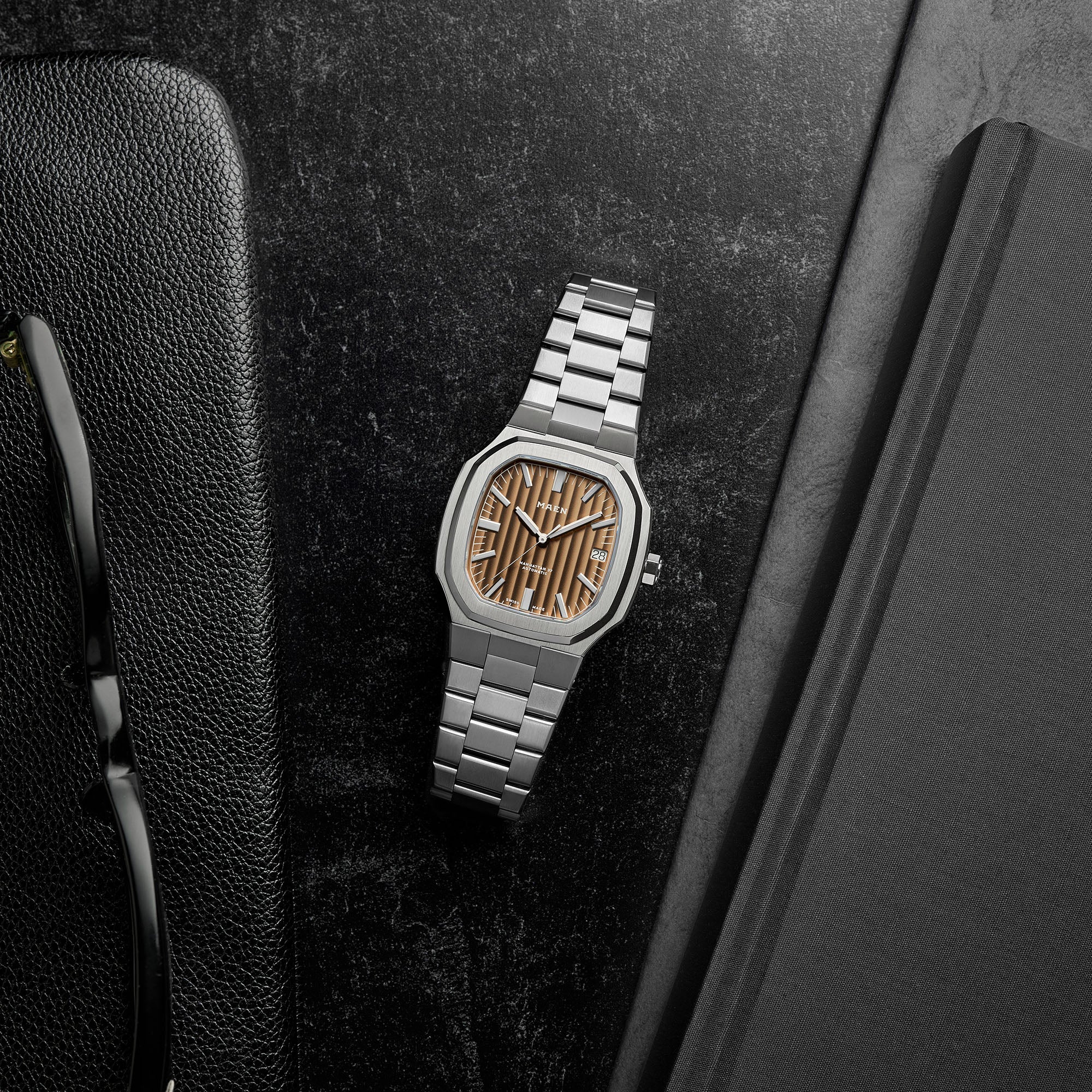 The Manhattan 37 has an unique vertically elongated Côtes de Genève dial that creates a spectrum of beautiful shimmers depending on the lighting.
