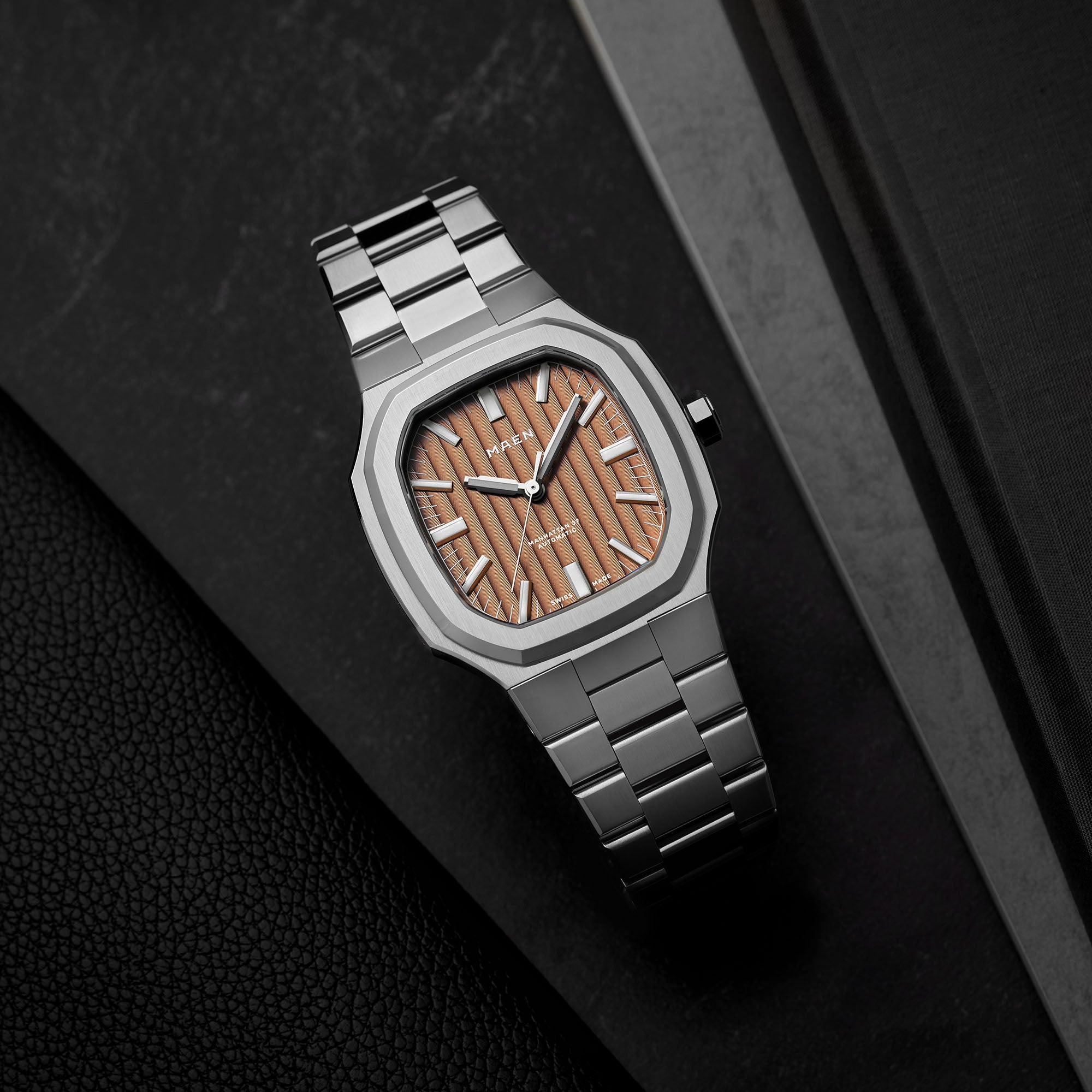 The Manhattan 37 has an unique vertically elongated Côtes de Genève dial that creates a spectrum of beautiful shimmers depending on the lighting.