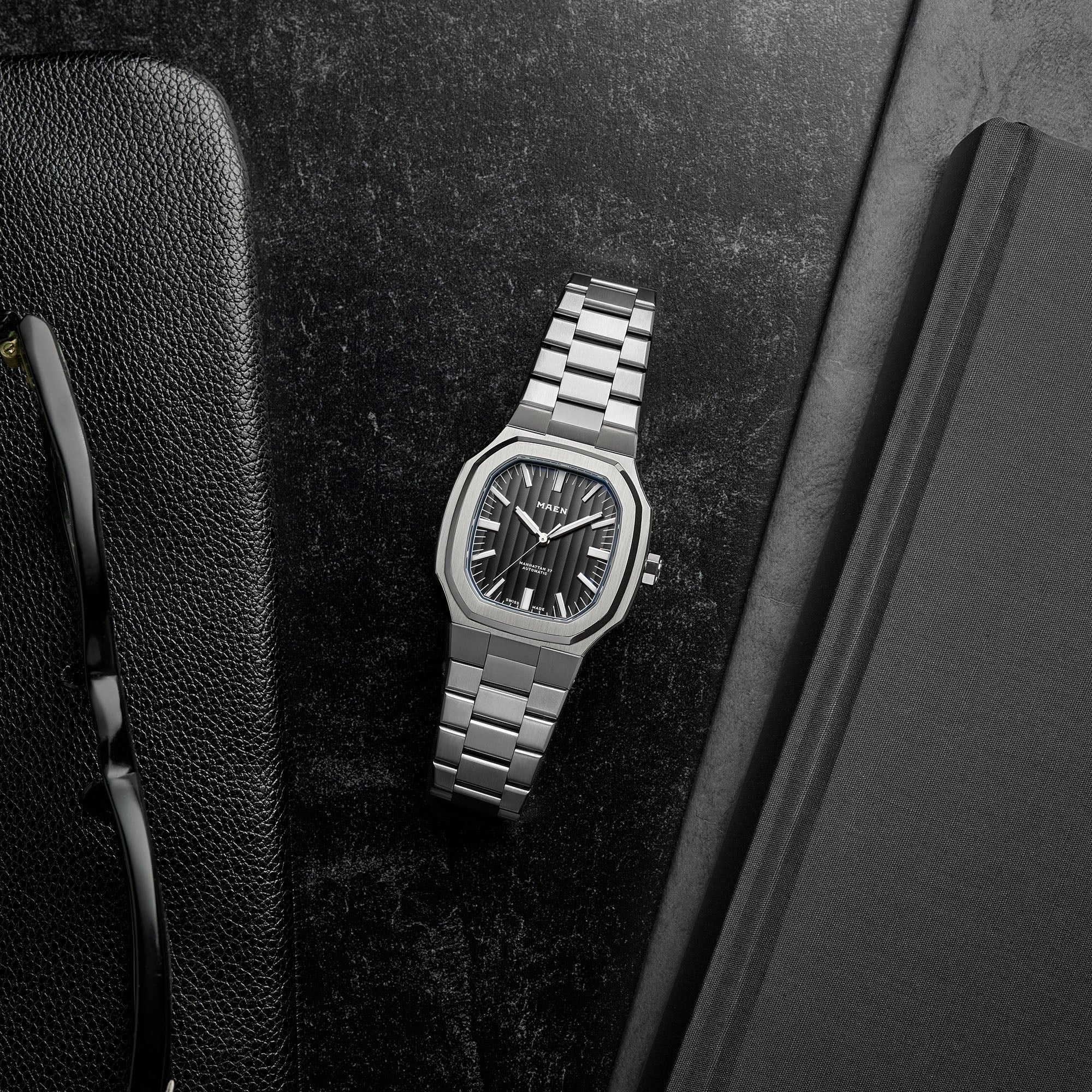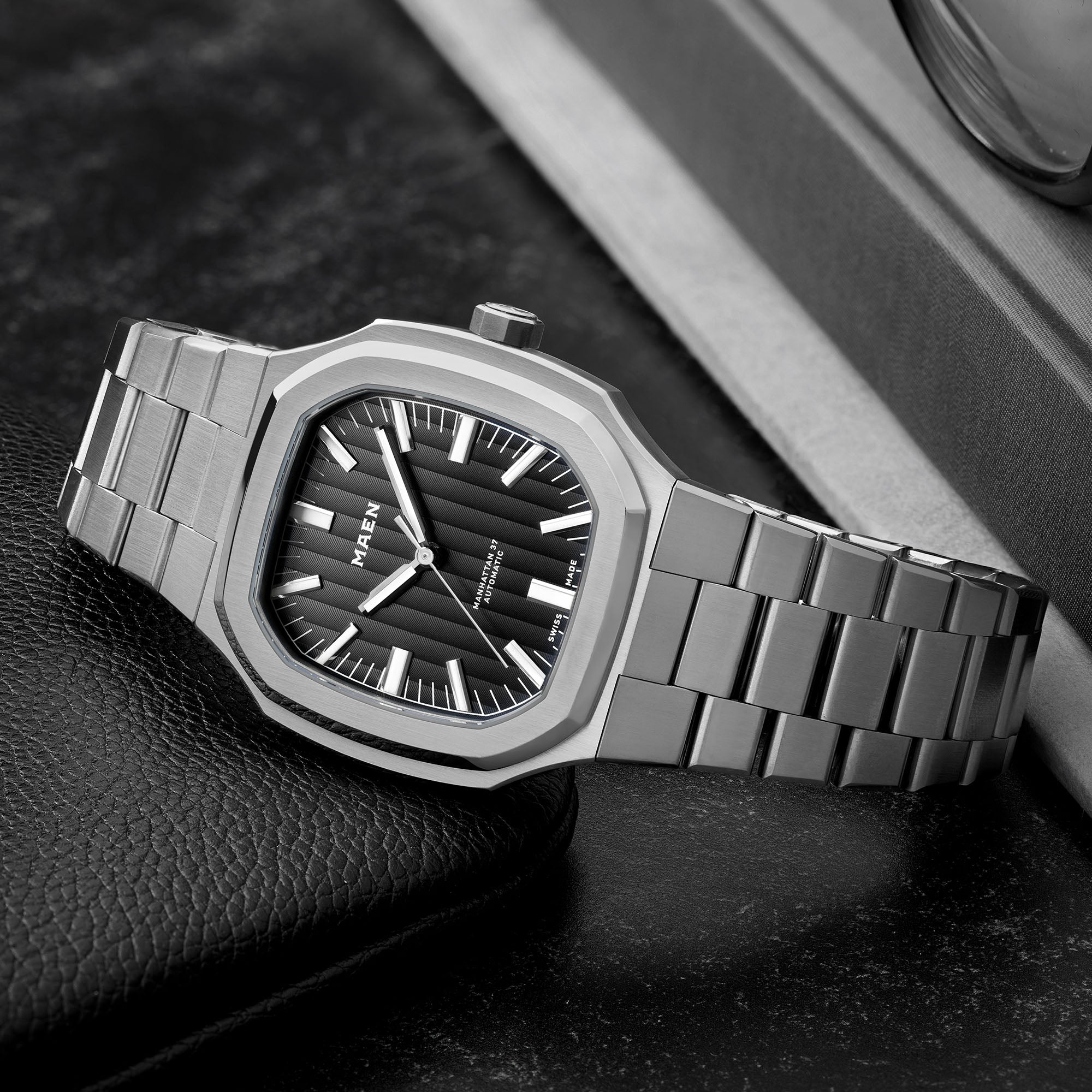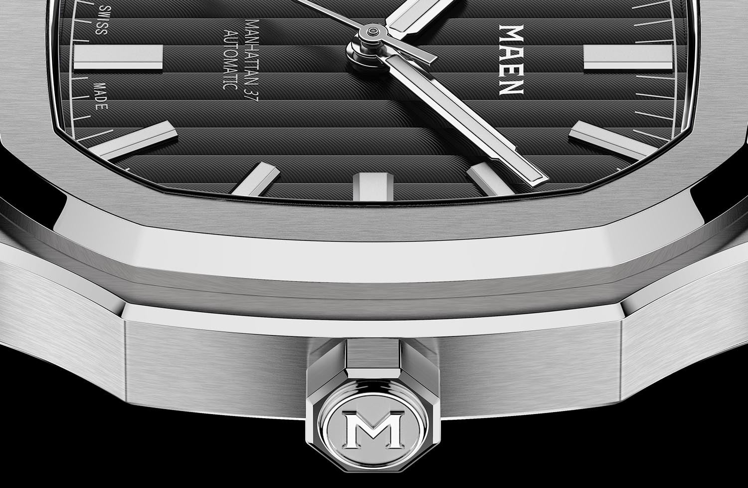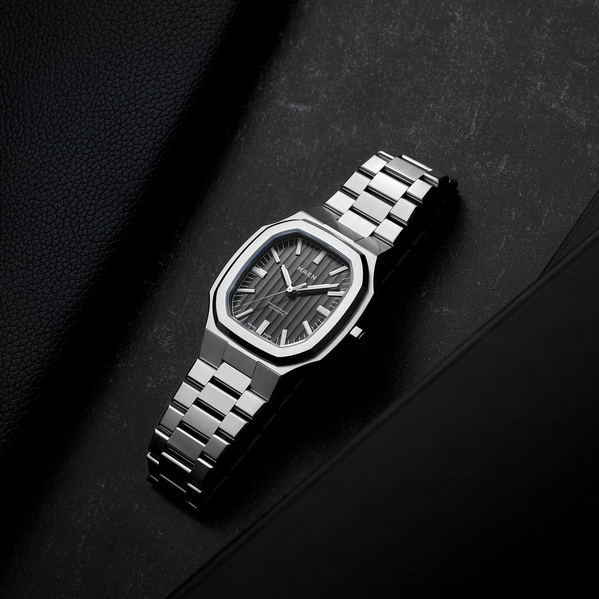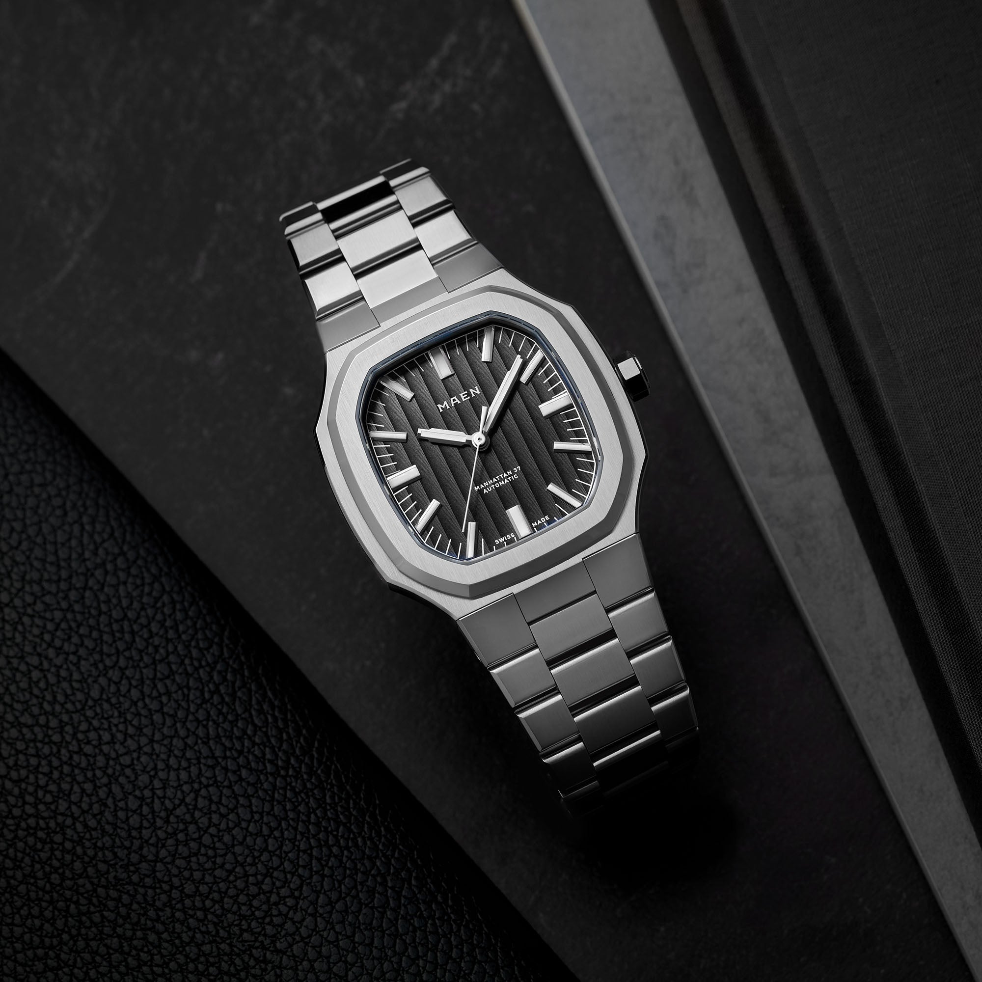 The Manhattan 37 has an unique vertically elongated Côtes de Genève dial that creates a spectrum of beautiful shimmers depending on the lighting.