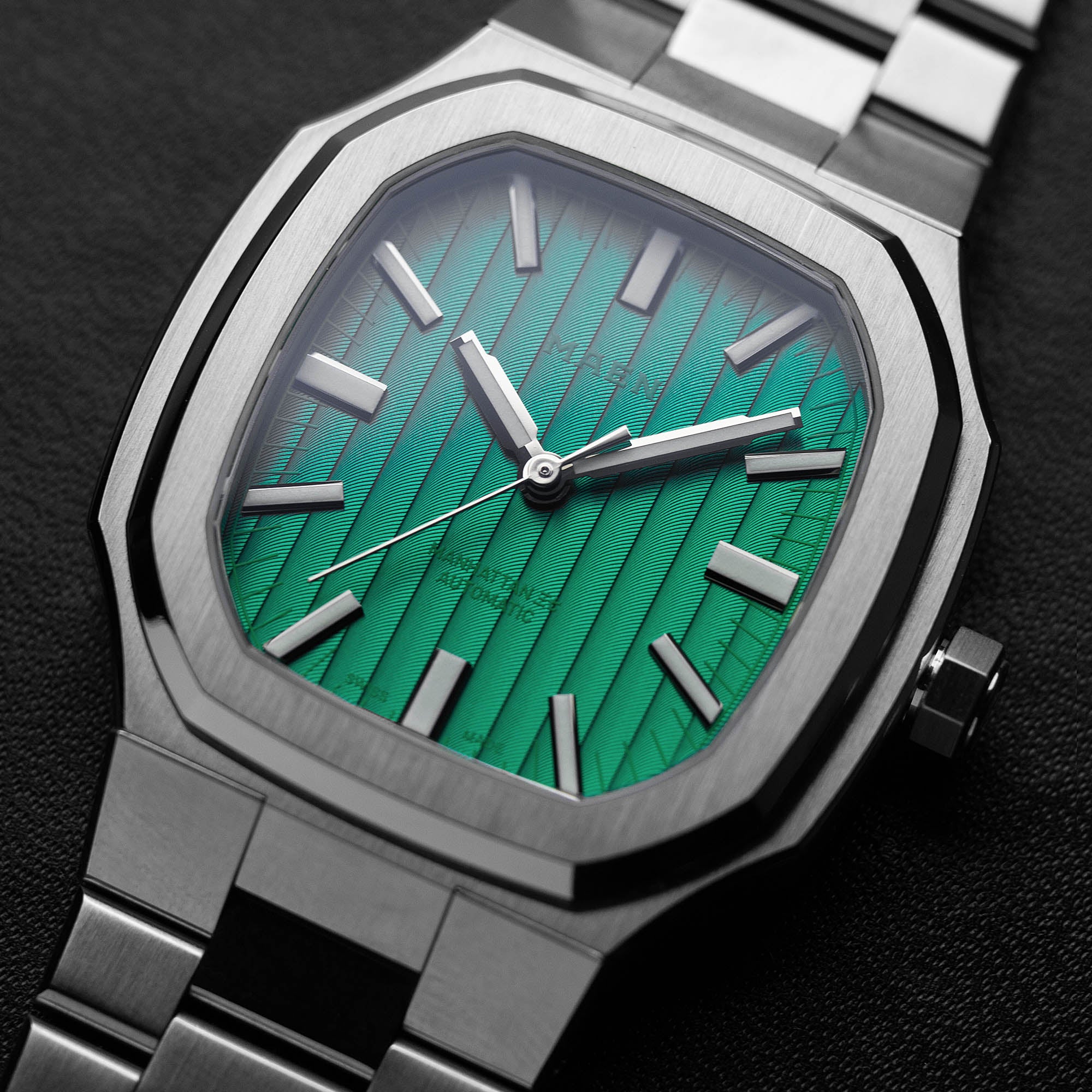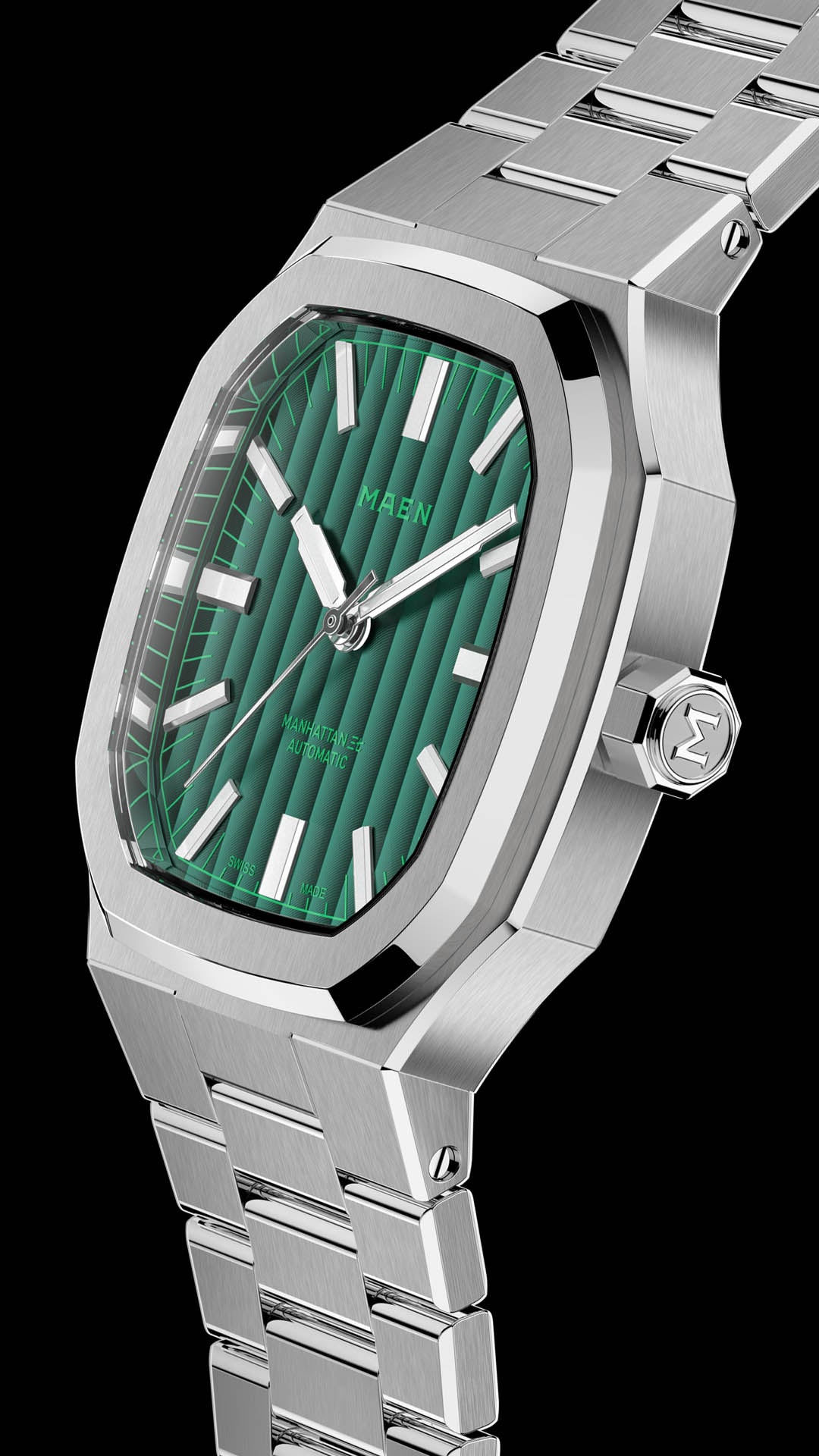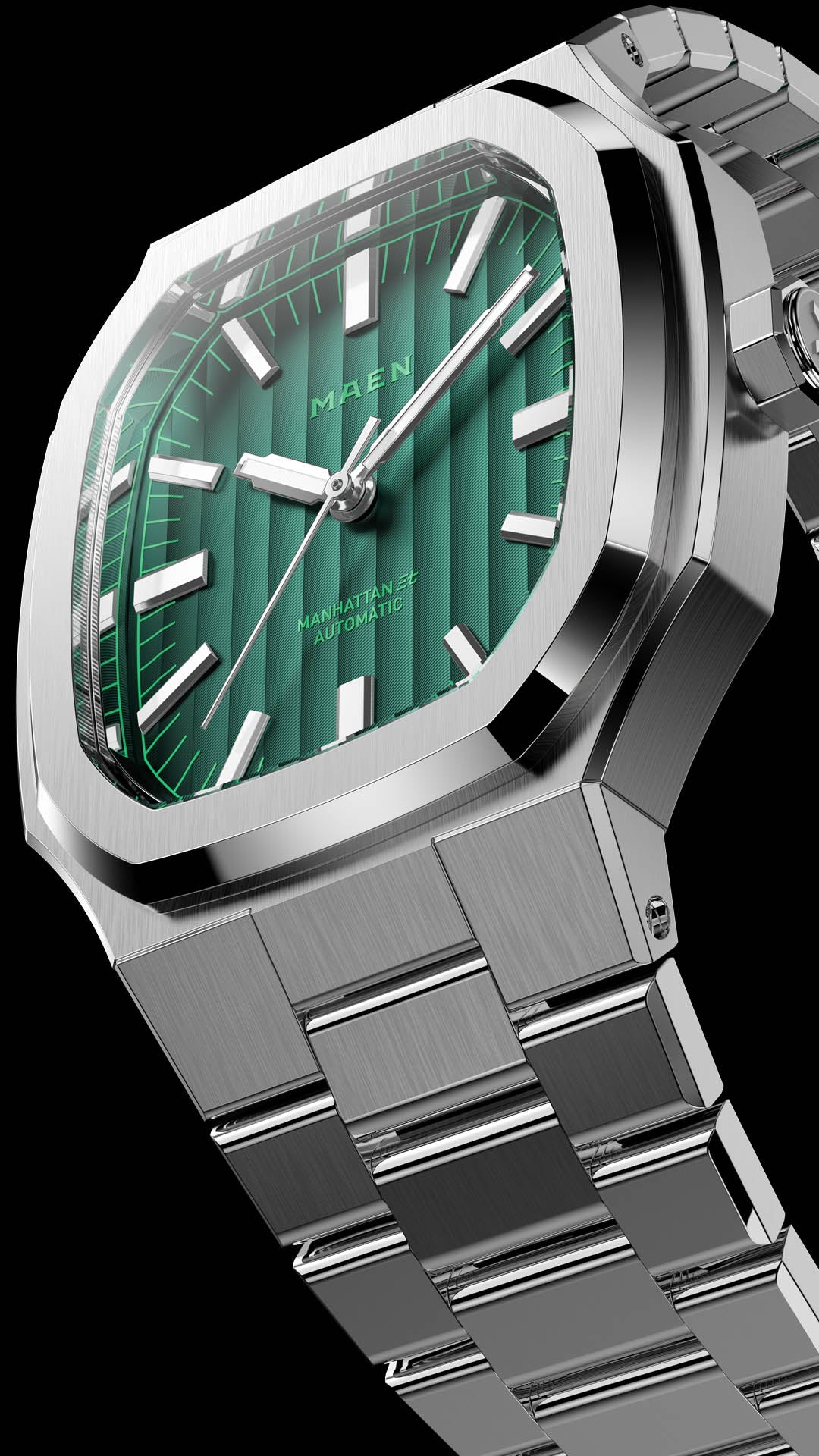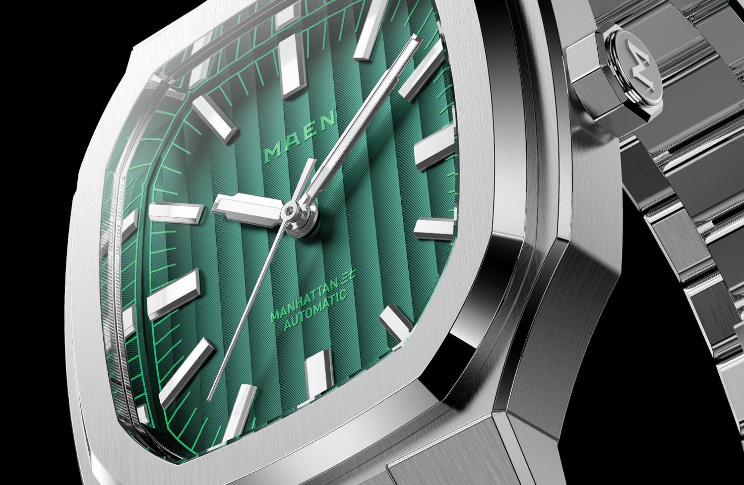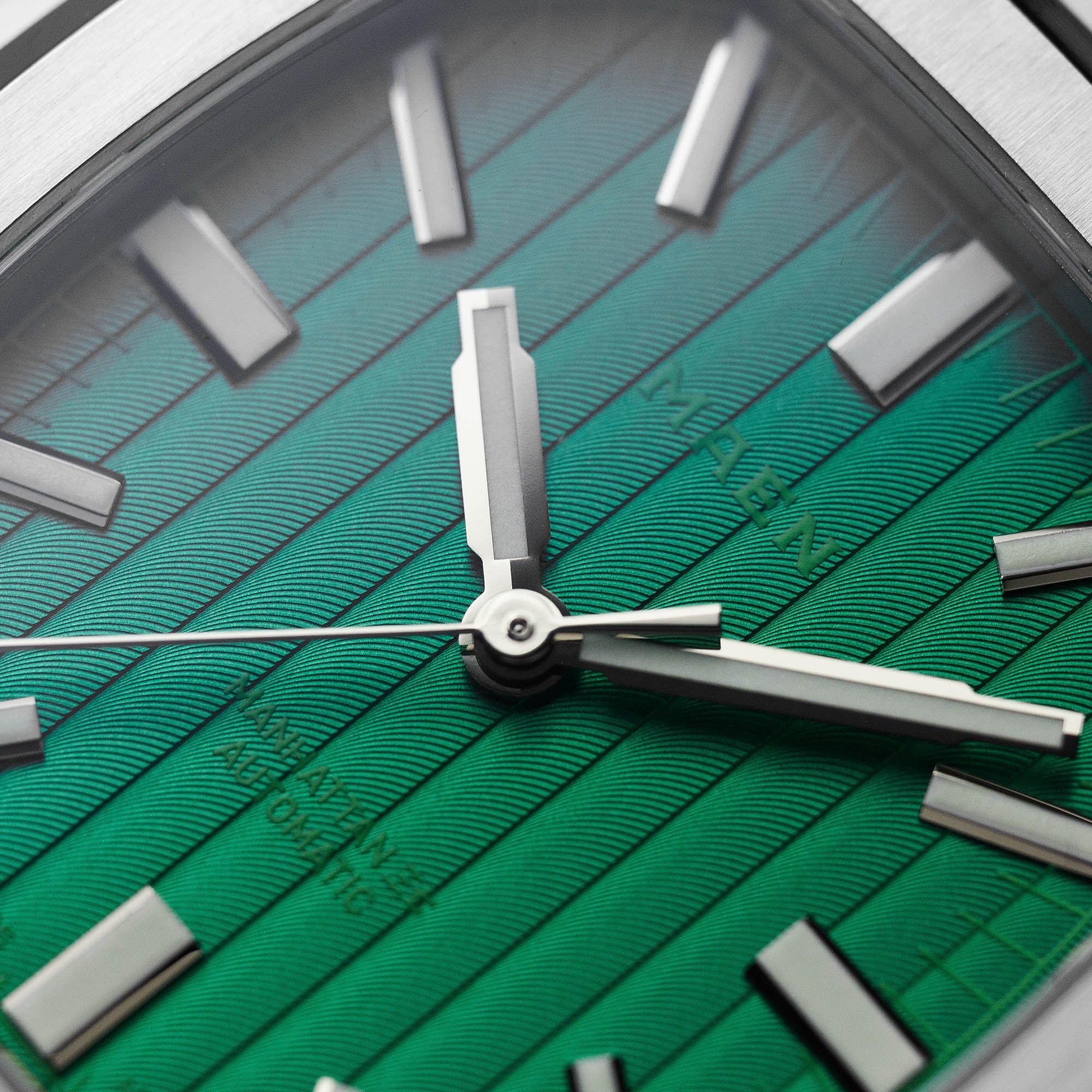 The Manhattan 37 dial captures the essence of Hong Kong's neon charm, with mesmerising green hues that evoke the vibrant glow of neon signs.