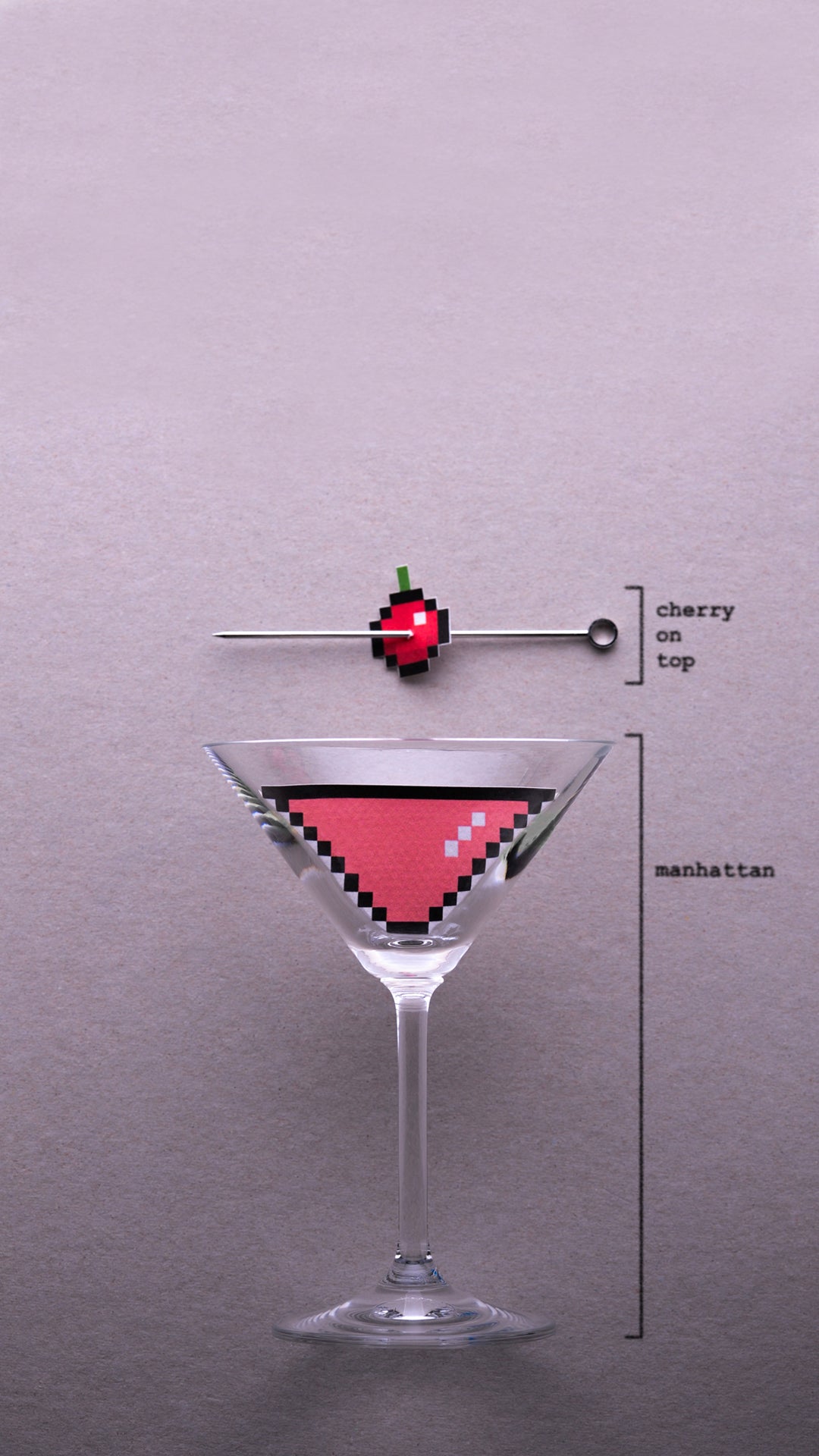 The second hand represents a cocktail pin with a pixelated Maraschino cherry which has been hand painted and assembled.