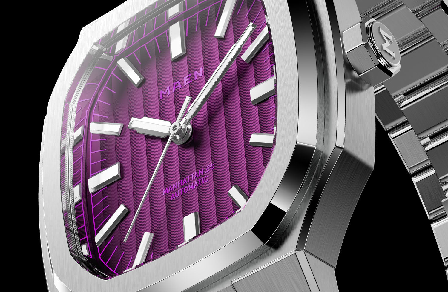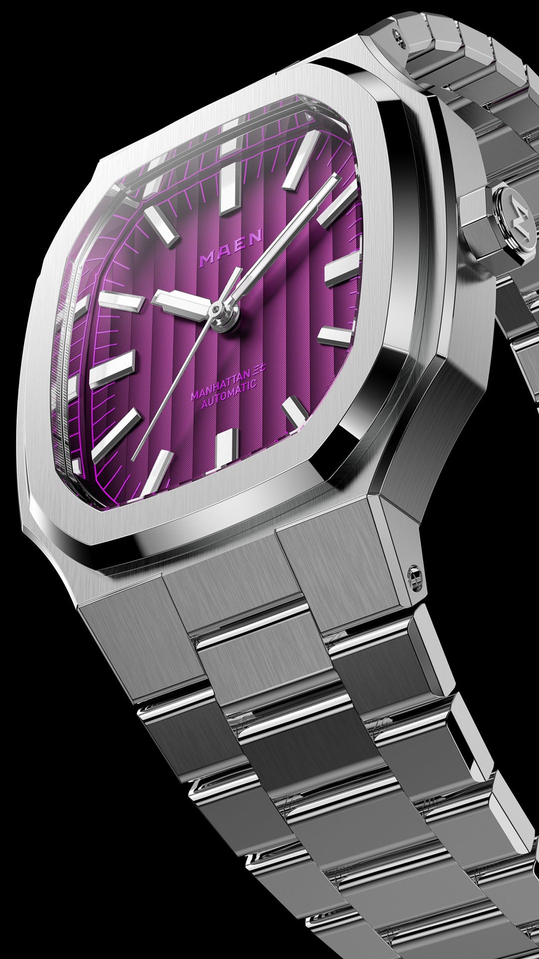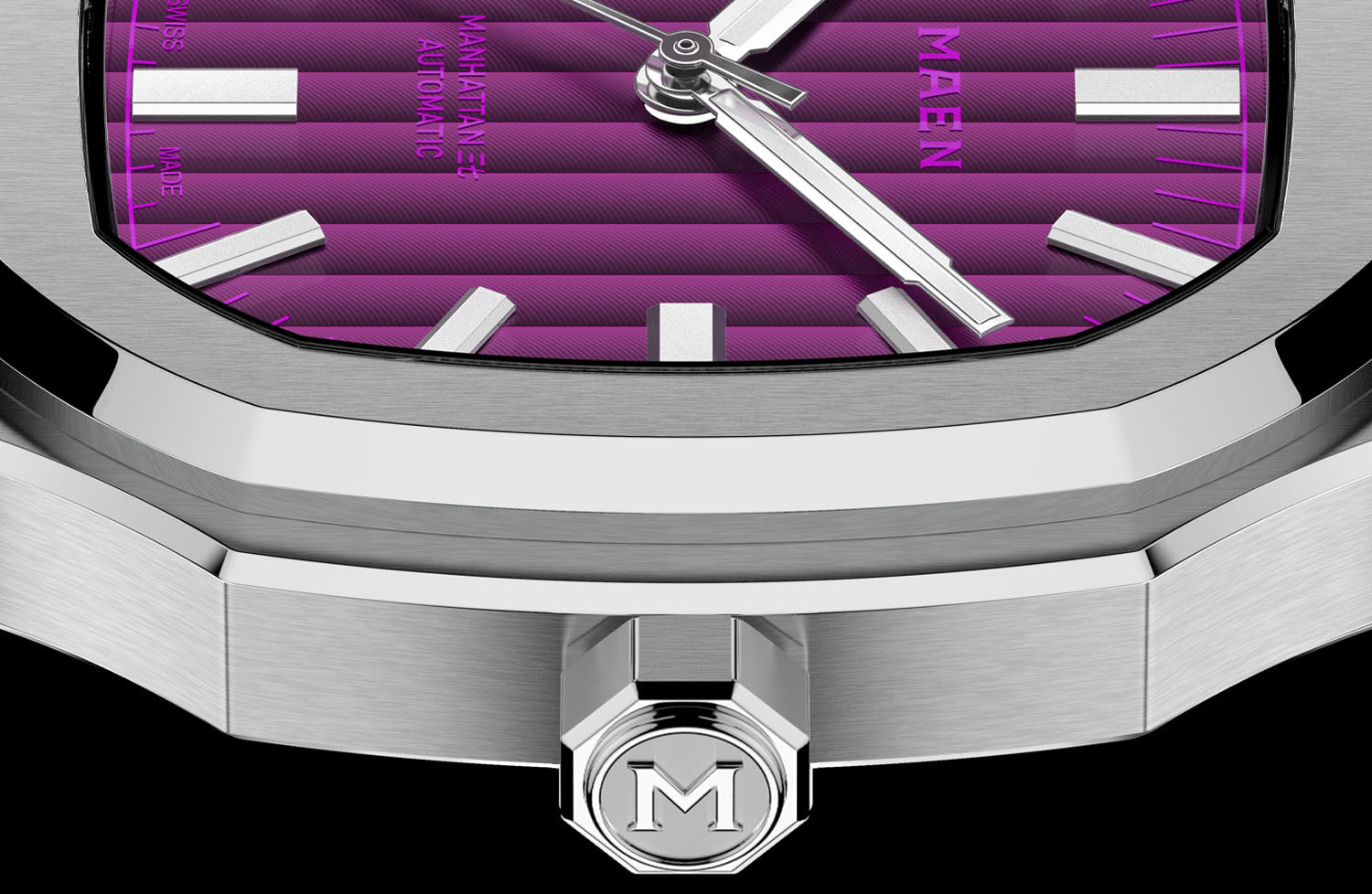 The Manhattan 37 features a striking Neon Purple "ghost dial," where the contrast between the dial, the indices, and the logo is intentionally subdued, creating a visual depth that immerses fans in the finest cyberpunk scenes.